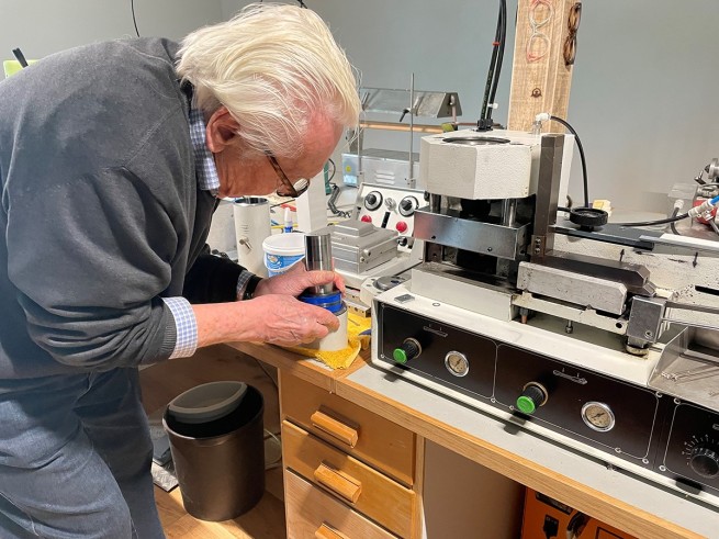 Im Video aus der WDR-Mediathek war es ja schon angedeutet: Die Maschine zum Einschießen der Bügel verliert Öl. Gerade ist Heinz Michel wieder bei uns in Münster und versucht die Reparatur.