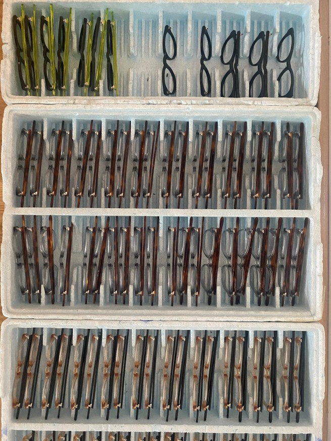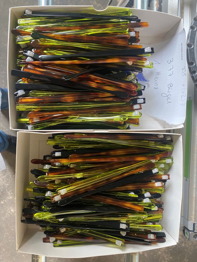 Die Bügel in havanna, schwarz und limette werden dann in Kürze an die Mittelteile in mandarin, khaki und schwart montiert