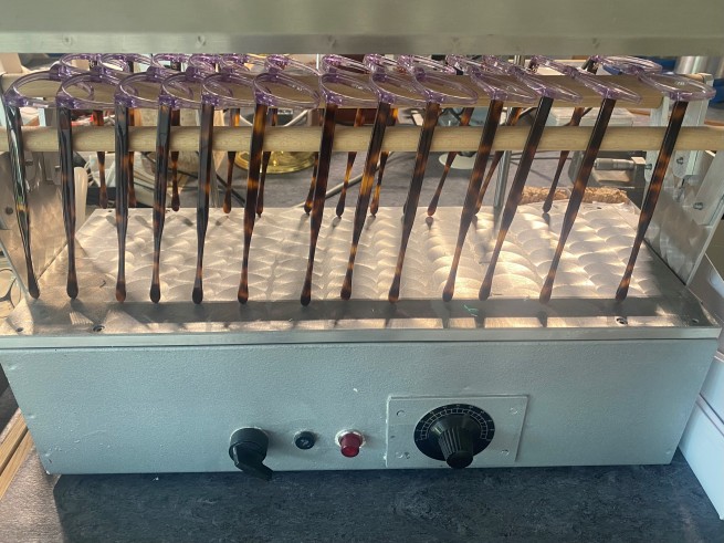 Um die Demoscheiben einsetzen zu können werden immer eine Anzahl Brillen gleichzeitig erwärmt.