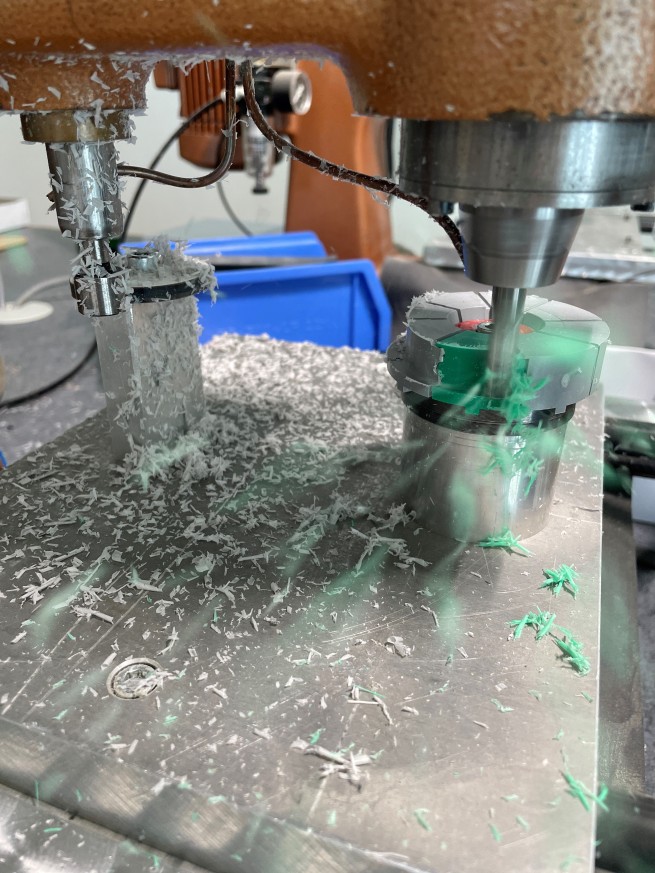 Dafür werden hier gerade die Spannscheiben hergestellt. Das Prinzip ist dasselbe wie beim Fräsen der Fassungen selbst: Von einer Mutterscheibe (links) werden durch Kopier- bzw. Abtasttechnik die benötigten Spannscheiben (rechts) hergestellt.