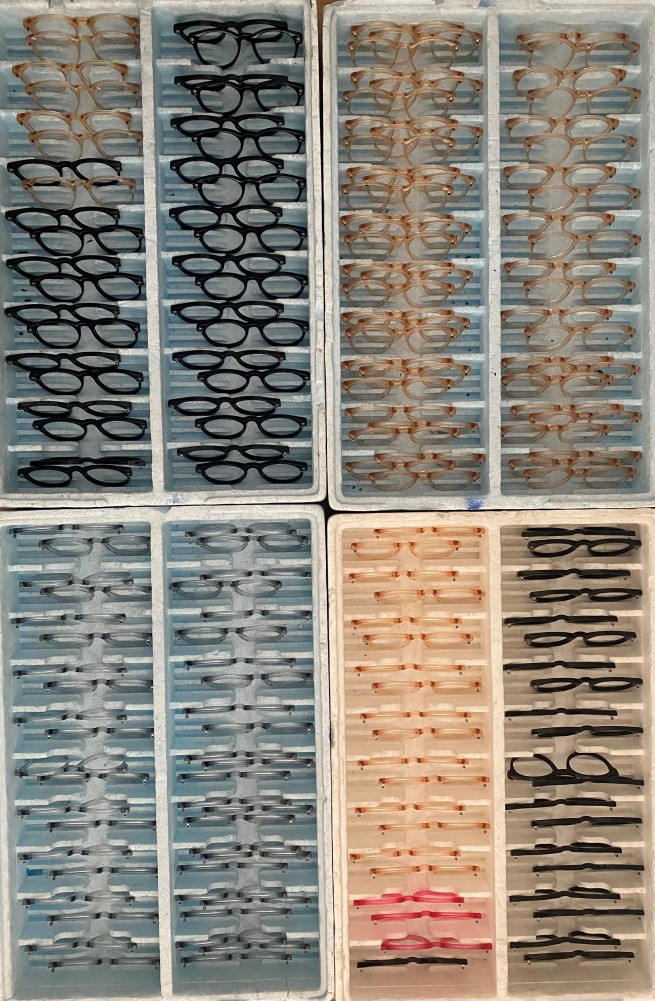 Hier warten in Reih und Glied fertige Brillenfassungen auf die letzten Arbeitsschritte: