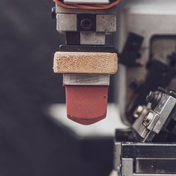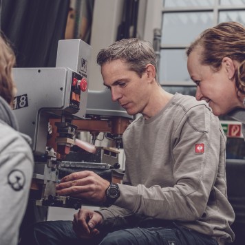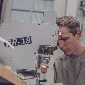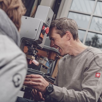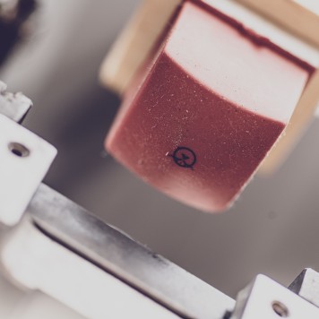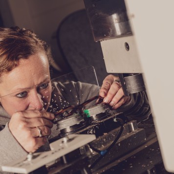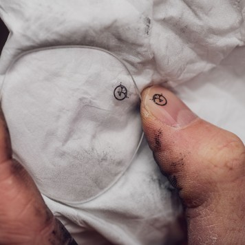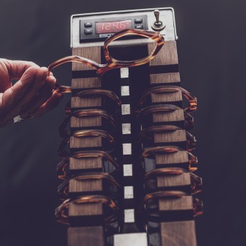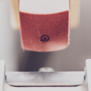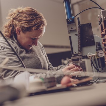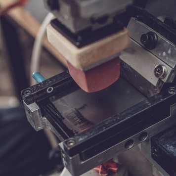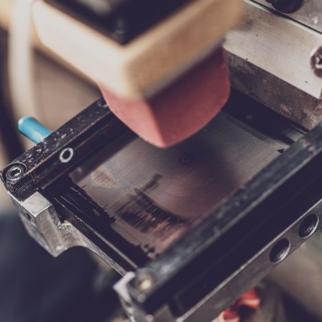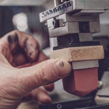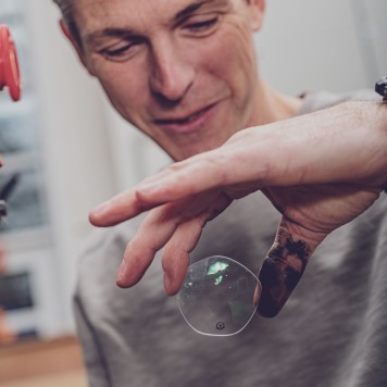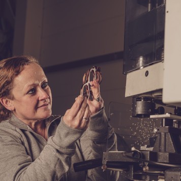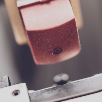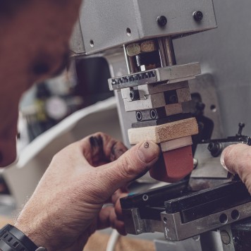 Nach dem die Mittelteile poliert sind, wird mit einer Tampon-Druck-Maschine die Beschriftung auf die Brille und die Stützscheiben gedruckt und anschließend montiert.