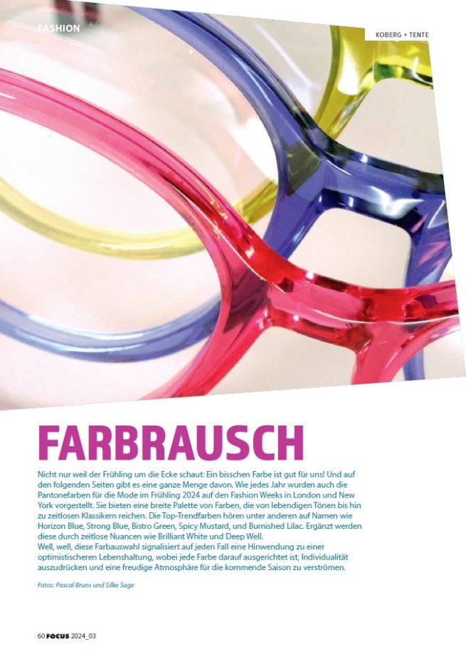 Im FOCUS Augenoptik Magazin 03/24 wird unter dem Titel "Farbrausch" unter anderem unser Modell 5197 in den Farben limette, pink und lila vorgestellt.