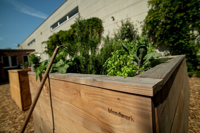 Für unseren „Innenhof“ sind vier Hochbeet-Einheiten geplant, die jedem Mitarbeiter die Möglichkeit geben, eigenes Gemüse, Kräuter oder auch Schnittblumen anzupflanzen. Auch Obstbäume/-sträucher und Weinreben werden demnächst an dieser Stelle gepflanzt. Als Grundstückseinfassung haben wir eine tierfreundliche Mischhhecke gewählt.